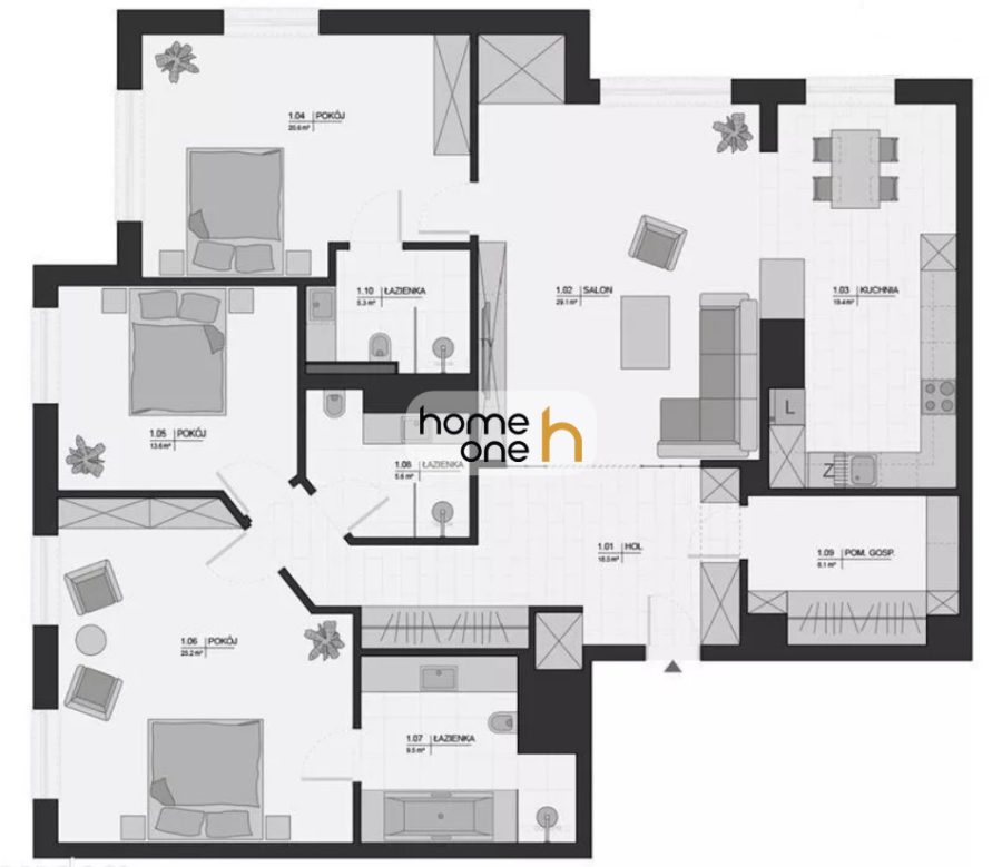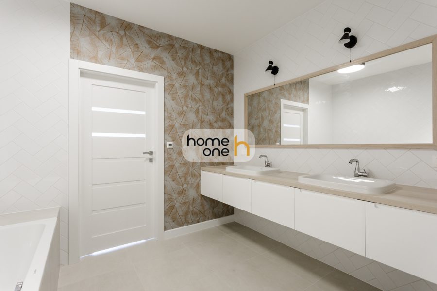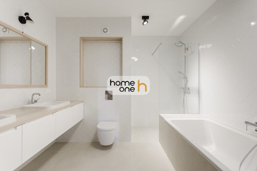 The 164 m² apartment offers a very functional and comfortable layout. The spacious kitchen with dining area seamlessly connects with the living room, creating a representative, open-plan living area. The property has three bedrooms and three bathrooms, including the master bathroom with a bathtub and shower. A separate utility room equipped with a washing machine and dryer is an added bonus.