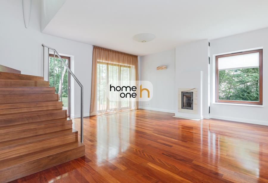 - Przestronny, jasny salon z kominkiem i wyjściem na taras oraz do ogrodu